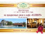 В поселке «Белый Берег» действует акция, согласной которой клиент, забронировавший недвижимость в апреле, получает в качестве бонуса сертификат номиналом 5 000 рублей на праздничный ужин от кафе «Колибри».